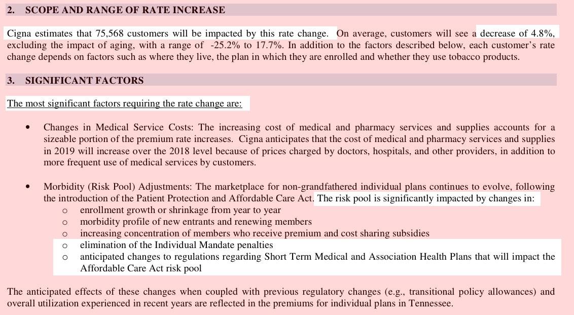 Remember, the RA thing is on top of the other big sabotage factors this year: Repeal of the ACA's individual mandate and the expansion of #ShortAssPlans. Those are, as usual, specifically called out by most of the TN carriers as well. None of them break the impact out specifically, so I'm once again using my standard estimate: 2/3 of what the Urban Institute projected these factors to be. In the case of Tennessee, Urban estimated around 18.1 percentage points would be tacked on, so I'm assuming this to be around 12 points to err on the side of caution.