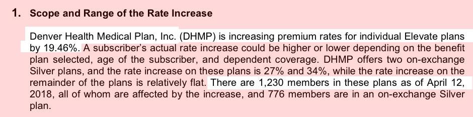 As you can see below, I don't have the hard enrollment numbers for some of the carriers, but the state insurance division has already done the weighted average calculation for me (5.94%). Several of the carriers specified how much they're raising rates due specifically to mandate repeal and/or #ShortAssPlans being expanded (10 points for HMO Colorado/Anthem and Rocky Mountain HMO, just 3.7 points for Friday Health Plans). The others didn't specify the impact, but most do mention it as a significant factor on rate hikes.