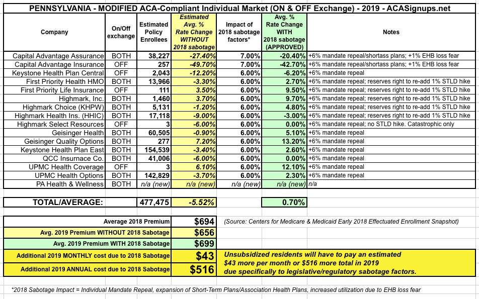 Pennsylvania: Modified 2019 ACA Rate Changes: 0.7% INCREASE *with* sabotage vs. 5.5% DROP *without* sabotage