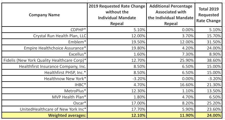 Here's what he's talking about: The New York Dept. of Financial Services rolled out preliminary 2019 ACA individual market rate changes in early June. While they vary by carrier, of course, overall the carriers projected that without the ACA's individual mandate penalty they'll have to jack up prices by around 24% vs. just half that if the mandate hadn't been repealed by Congressional Republicans last December. Both of these numbers are somewhat higher than most other states, but neither is too unreasonable under the circumstances: