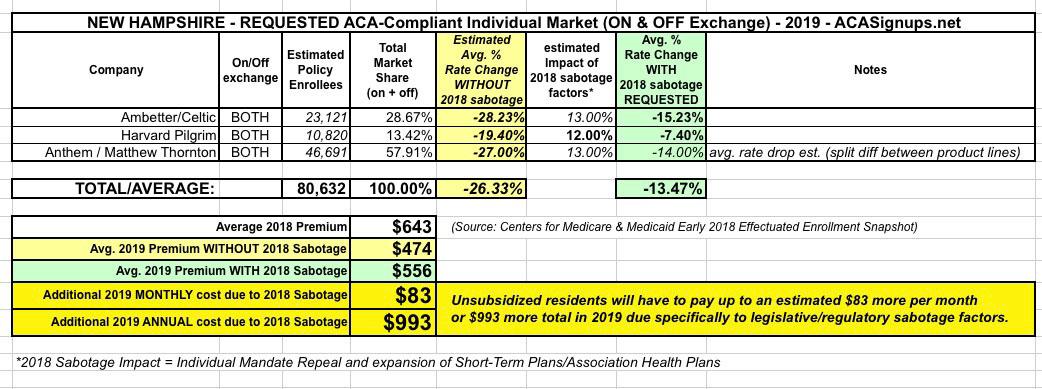 New Hampshire: Preliminary 2019 #ACA rates: 13.5% DROP...but would have dropped by up to *26%* without #ACASabotage