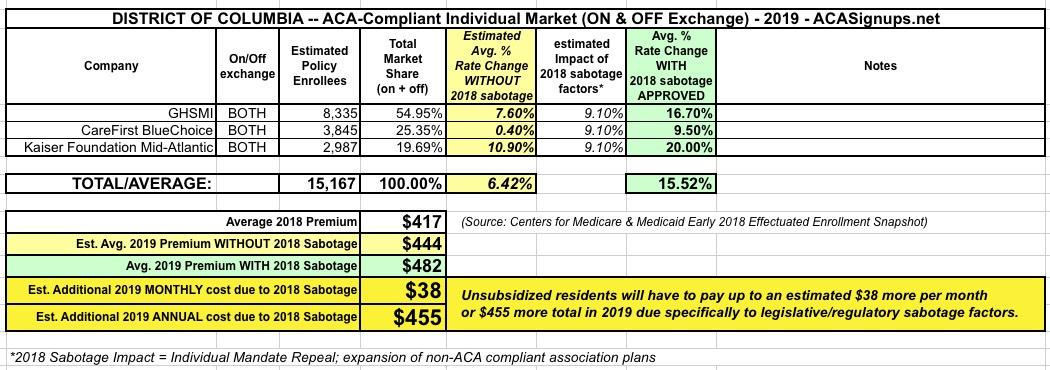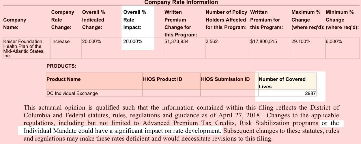 Meanwhile, back in June, DC carriers submitted their preliminary 2019 premium increases, averaging around 15.5%...and at least one carrier made it pretty clear that repeal of the mandate was the cause of a pretty significant portion of their rate hike: