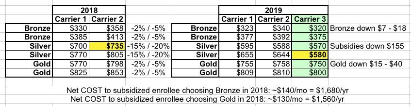 As you can see, if the subsidized enrollee chose a Gold plan in 2018, they'll likely pay almost exactly the same in 2019 as well...their net premium may even drop a buck or two more per month. However, if they chose a Bronze plan, they'll pay around $8 more per month, since their subsidies dropped by more than their premium did. Annoying, but not devastating.