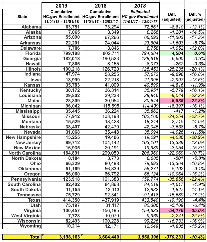Adjusting for the 1-day difference however, HC.gov enrolled around 3.57 million people in the first 31 days last year, so the 2019 season is running around 10.4% cumulatively lower year over year for the first 31 days.