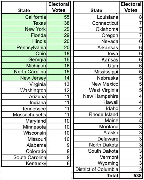 Here's a list of states ranked by the number of Electoral Votes each has. As you can see, the first 11 states add up to exactly 270 electoral votes...enough to just barely win a majority of the Electoral College (538 total).