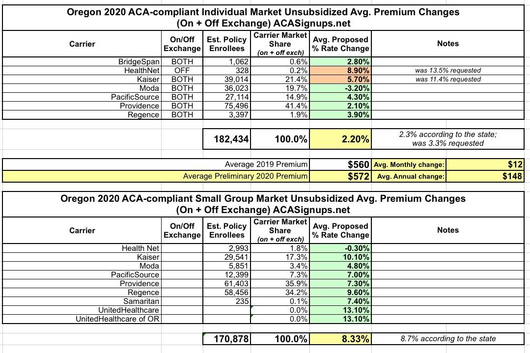 Oregon: SEMI-APPROVED 2020 ACA Exchange Premium Rate Changes: 2.3% increase.