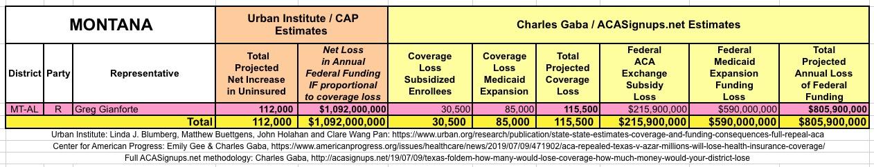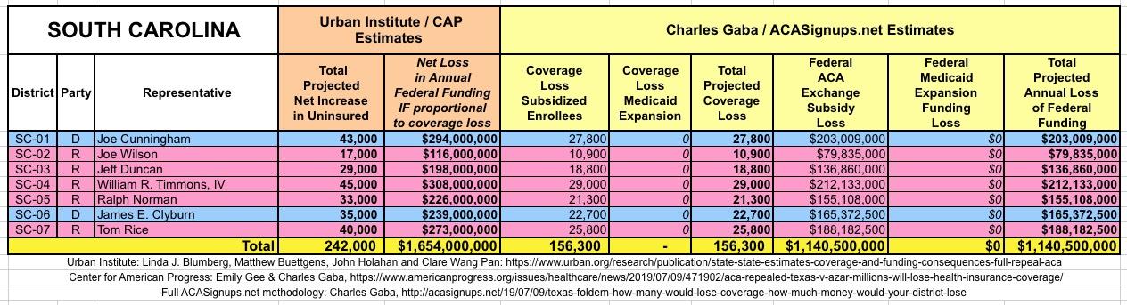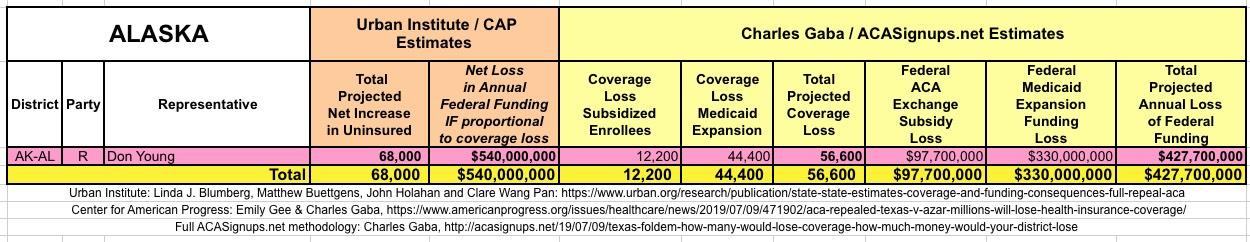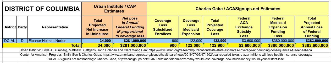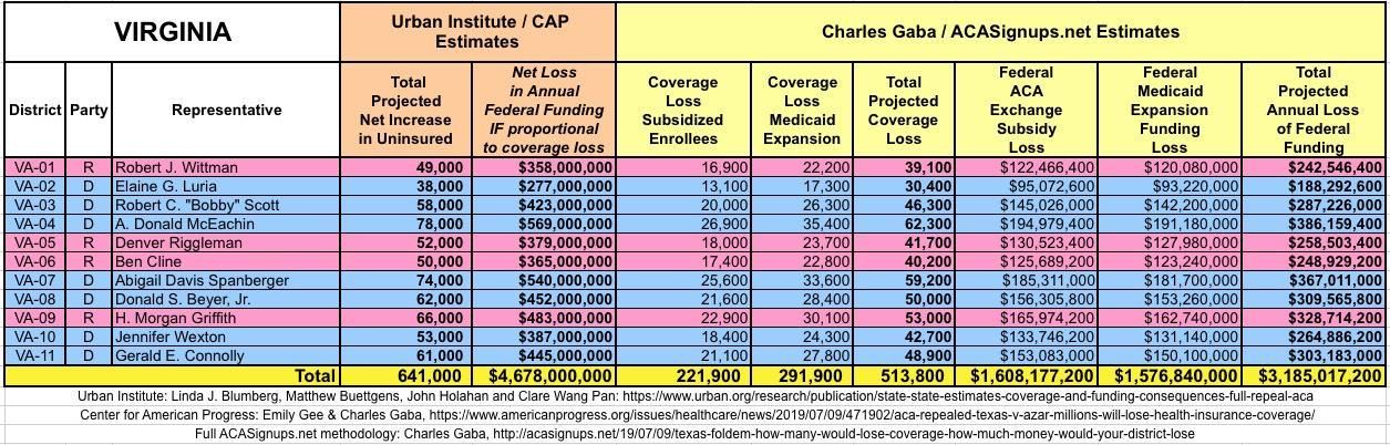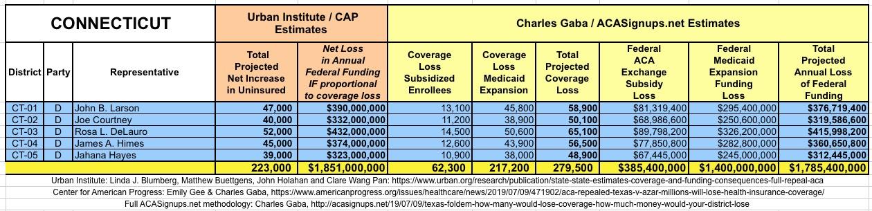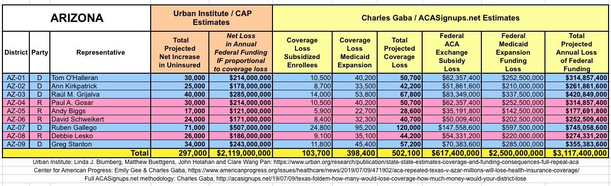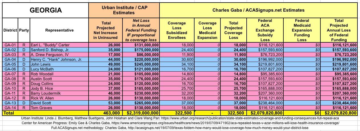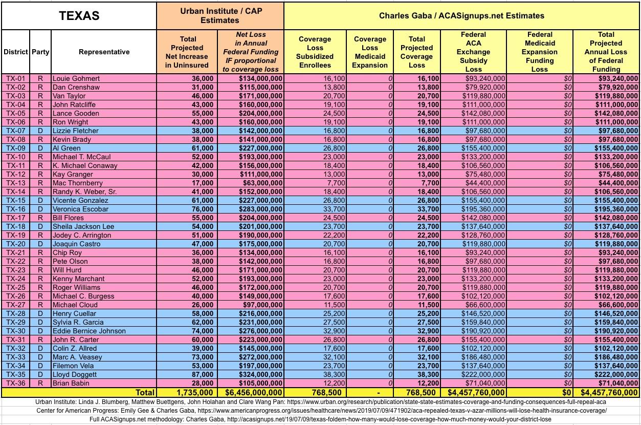 In March 2019, Linda J. Blumberg, Matthew Buettgens, John Holahan and Clare Wang Pan of the Urban Institute ran a detailed analysis to determine what the impact on healthcare coverage would be in every state if the Texas vs. U.S. lawsuit (aka Texas vs. Azar or #TexasFoldEm) caused the Patient Protection & Affordable Care Act (ACA) to be repealed with immediate effect.