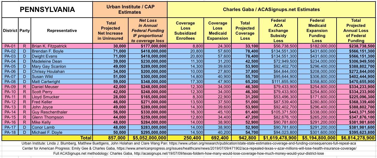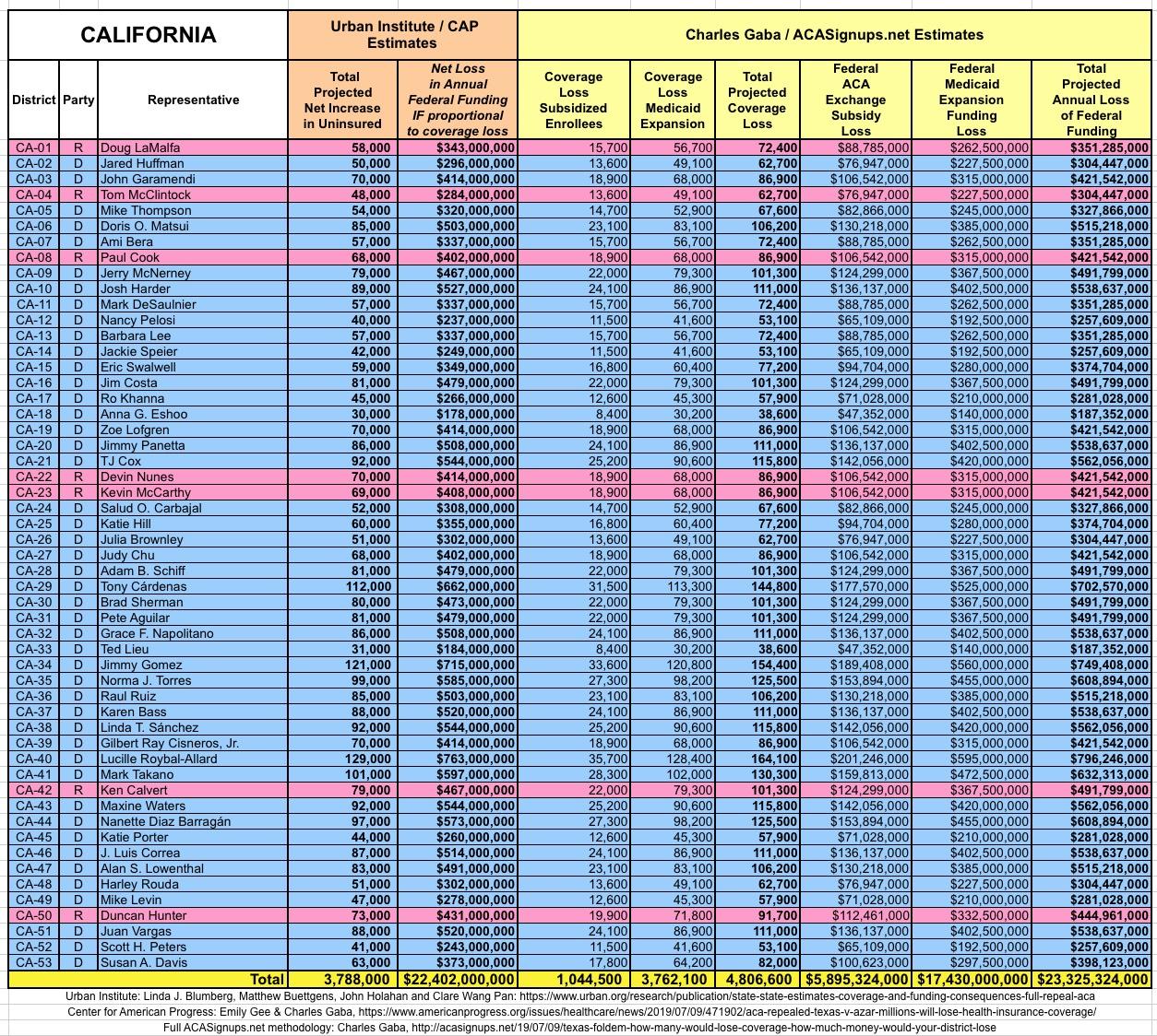 The Urban/CAP numbers are probably more accurate, but mine have one advantage: I've broken out both the coverage losses and funding losses by category (Individual Exchange Market/BHP and Medicaid Expansion). In addition, I've color-coded the Congressional Districts by which party each U.S. Representative is a member of.