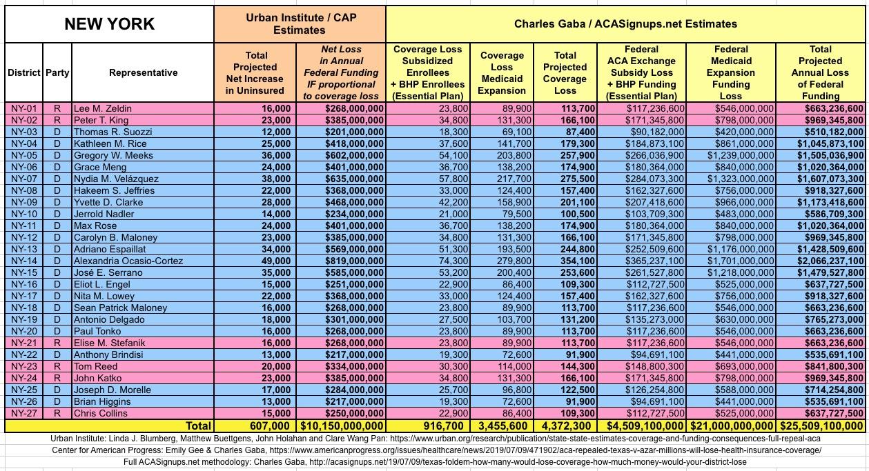 It's important to clarify that while the CD-level projections for net coverage losses have been run through CAP's analytical modeling, my CD-level federal funding loss estimates are based on a simple proportional model: If a given district shows 20% of the statewide coverage losses, I'm assuming a corresponding 20% portion of the federal funding loss. I recognize that this isn't the most accurate way of doing it, but it's the best I could come up with. At the very least it should give some sense of the amount of money being lost which we're talking about here.
