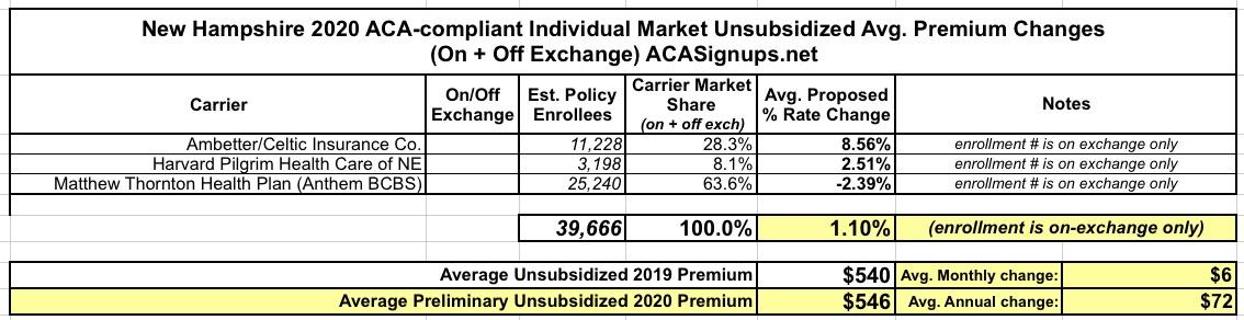 New Hampshire: *Preliminary* avg. 2020 ACA premium changes: 1.1% increase
