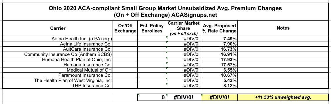 UPDATE: HealthCare.Gov's Rate Review database is now live for 2020, so I was finally able to plug in most (but frustratingly, not all) of the rate change and enrollment data for Ohio carriers on both the Individual and Small Group markets: