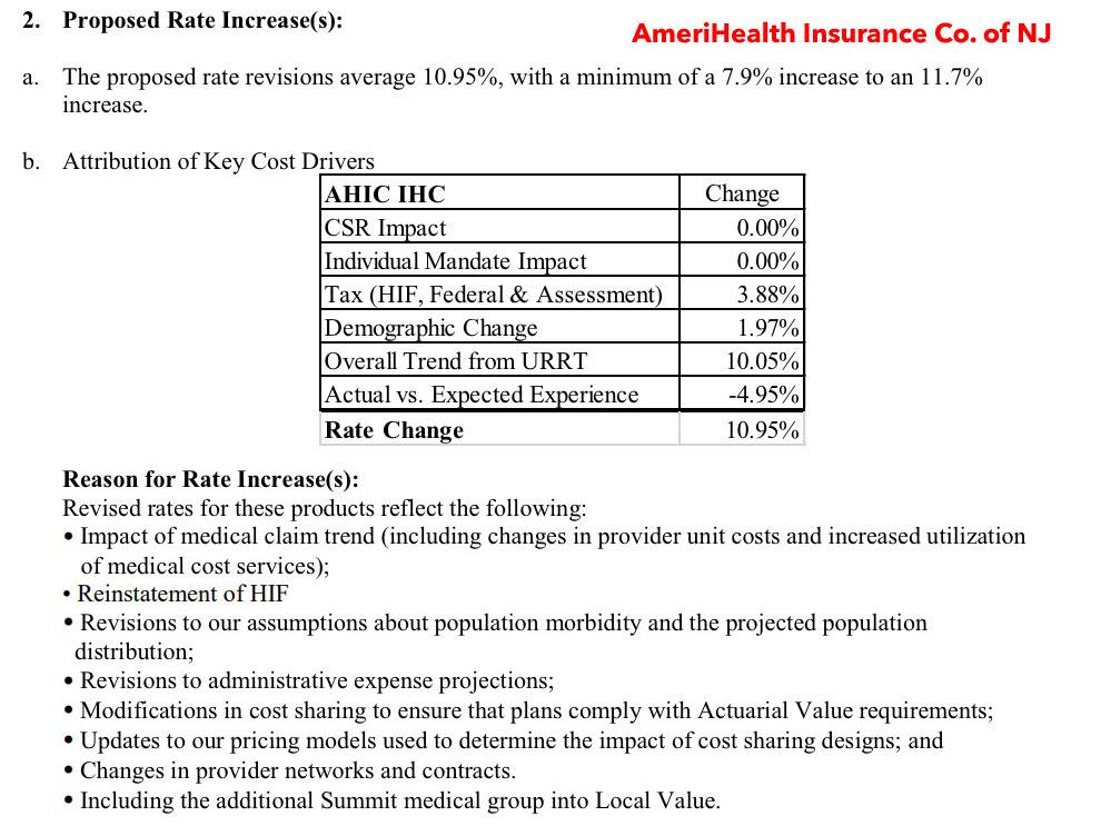 On the surface, this might make it sound like NJ's mandate reinstatement was ineffective (likely in part due to the reasons I noted above). However, the actual rate filings from two of the six carriers on the market (technically a single carrier with two divisions...AmeriHealth HMO and AmeriHealth Insurance Co.) suggest a different reason. I don't know about the other four carriers, but according to AmeriHealth: