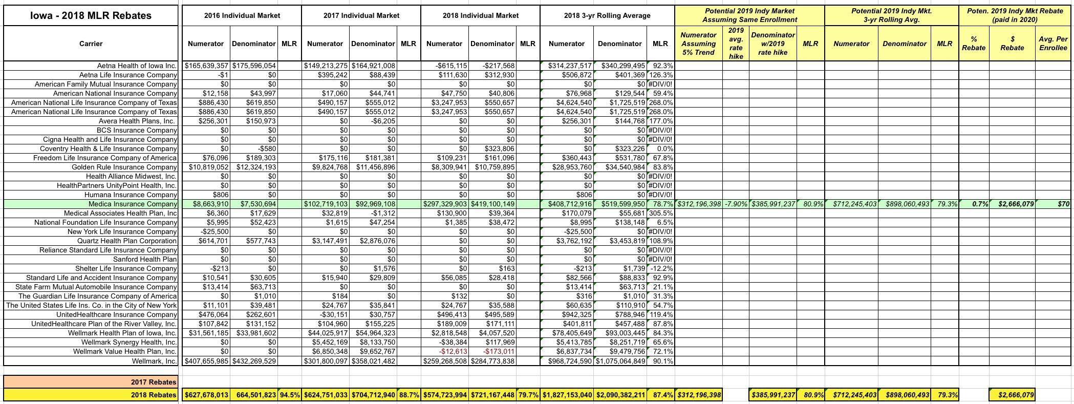 AGAIN: There's absolutely no guarantee that things will play out this way. It's possible that none of these carriers will make MLR payments next year, or only some of them will, or the amounts will be smaller. These 2019 projections are pure speculation on my part based on a number of big assumptions.