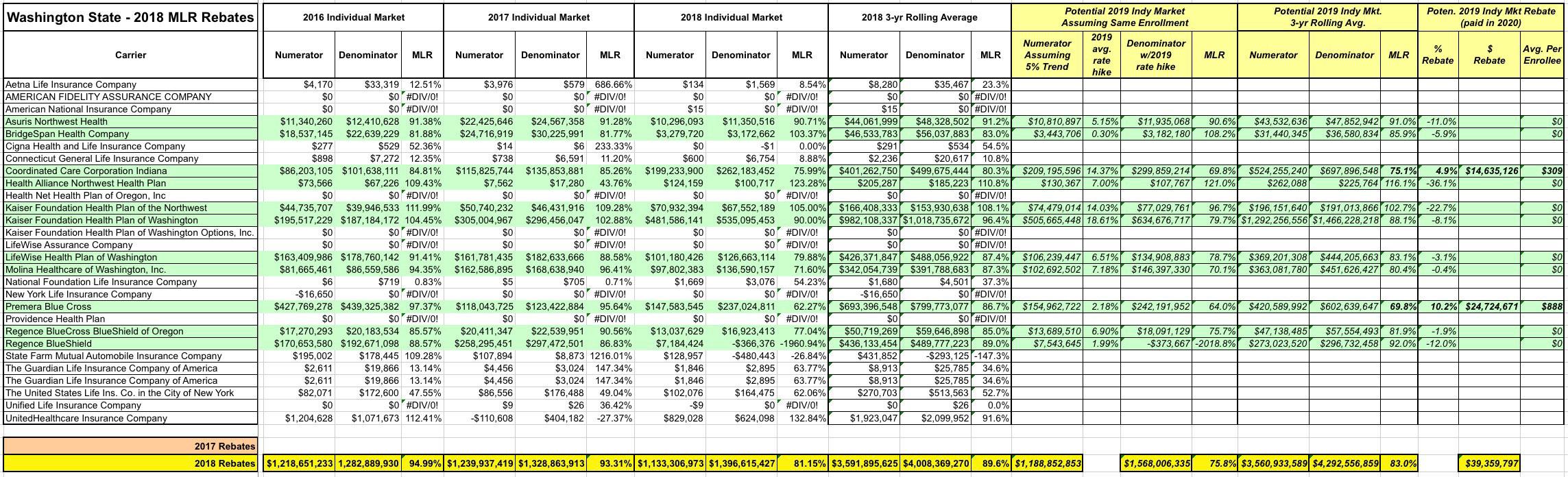 AGAIN: There's absolutely no guarantee that things will play out this way. It's possible that none of these carriers will make MLR payments next year, or only some of them will, or the amounts will be smaller. These 2019 projections are pure speculation on my part based on a number of big assumptions.