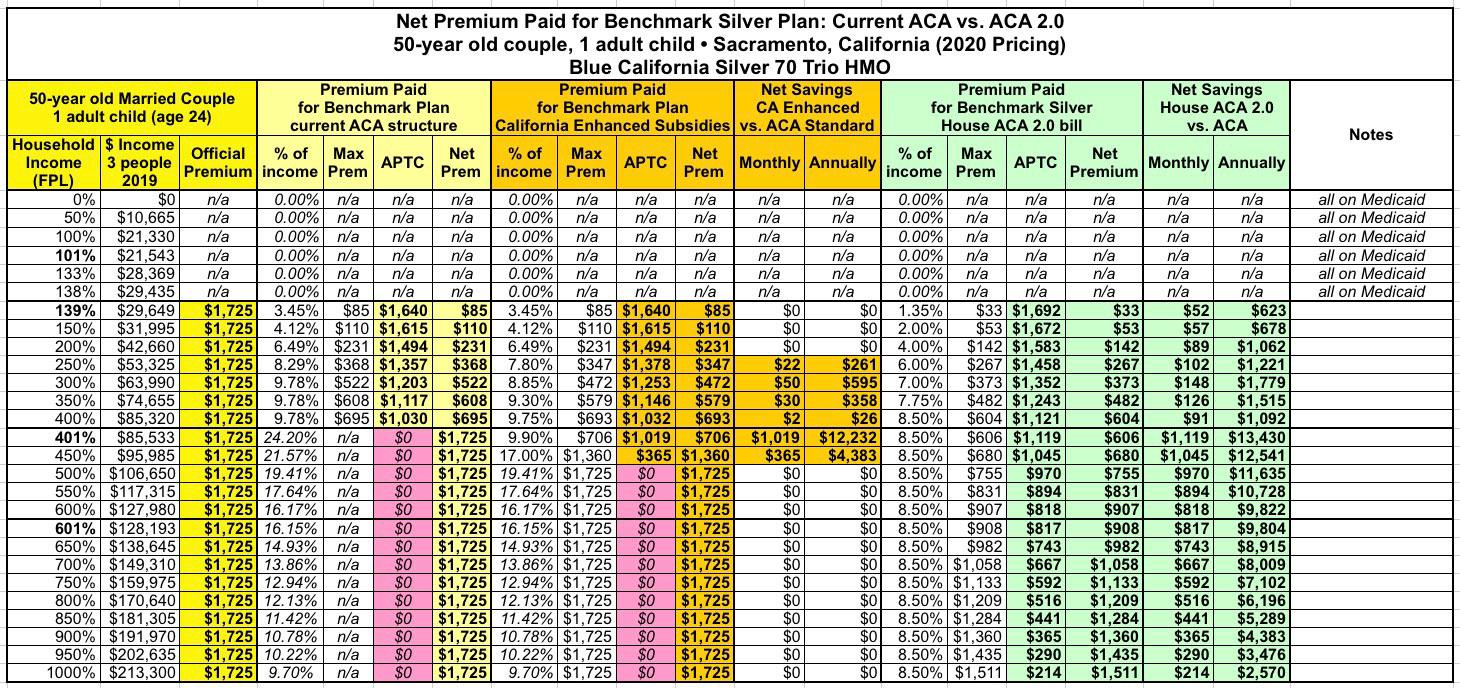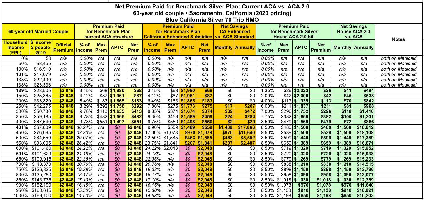 I've also included a third overlay on the tables below: The federal House Democrats ACA 2.0 bill (either H.R. 1868 or H.R. 1884), which would cap premiums at no more than 8.5% of income. The official ACA formula is in Manilla; the California subsidy formula is in Orange, and the proposed ACA 2.0 structure is in Green.