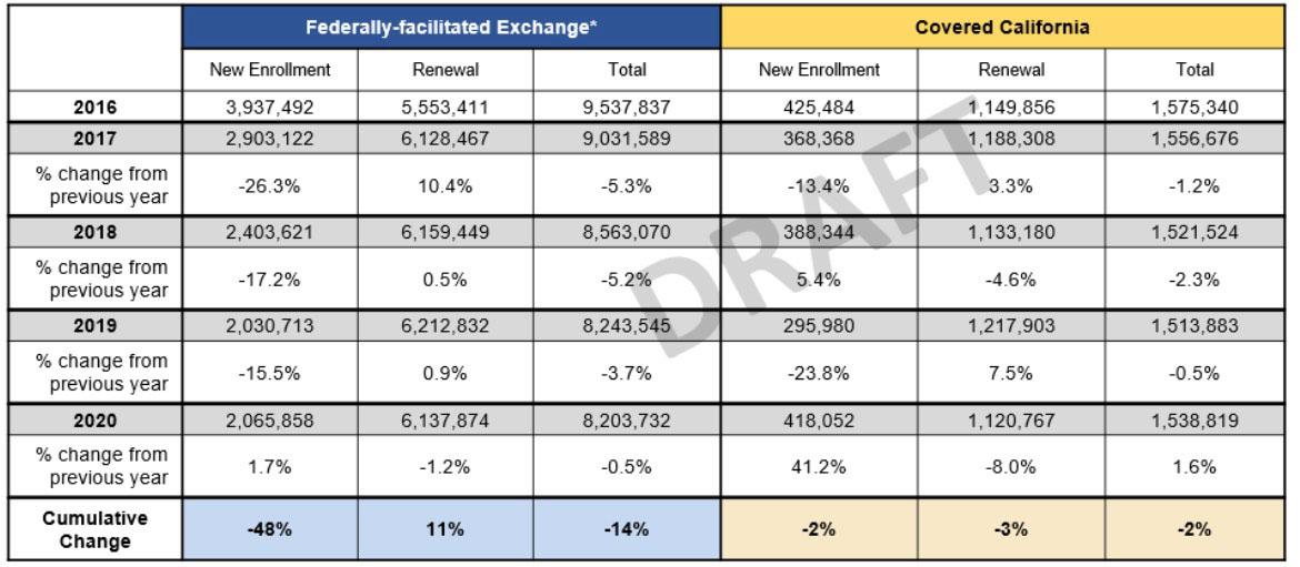 Figure 2: Comparing New Enrollment in Covered California and FFE, 2016-2020[3]
