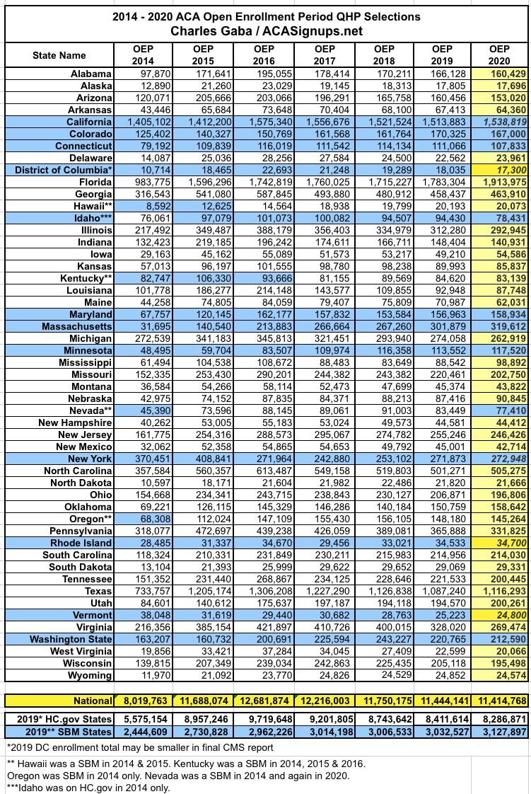 For OEP 2020, the numbers listed are official for all FFM states and for most SBM states. In a few SBM cases the numbers are estimates extrapolated from incomplete data, but should be very close to whatever the final, official number reported by the Centers for Medicare & Medicaid end up being.