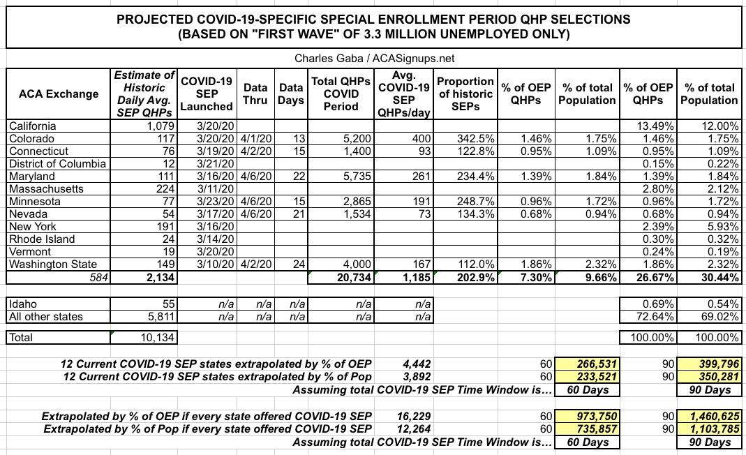 The only way I can figure out what impact the COVID-19 SEP is having is to compare the number of COVID SEP enrollees against what they'd typically be during the same time period. This is a very crude methodology for several reasons, and the data is still pretty sparse, but again, it's the best I can do for the moment. Unfortuantely, of the 12 state-based exchanges which have launched official COVID SEPs, only four of them have released any hard data so far to my knowledge (they happen to be four of the ones which have extended their deadlines).