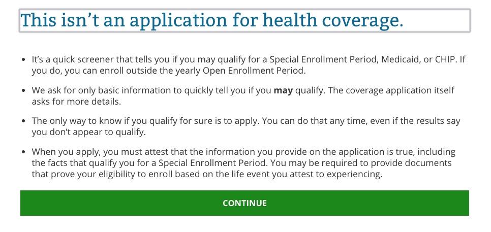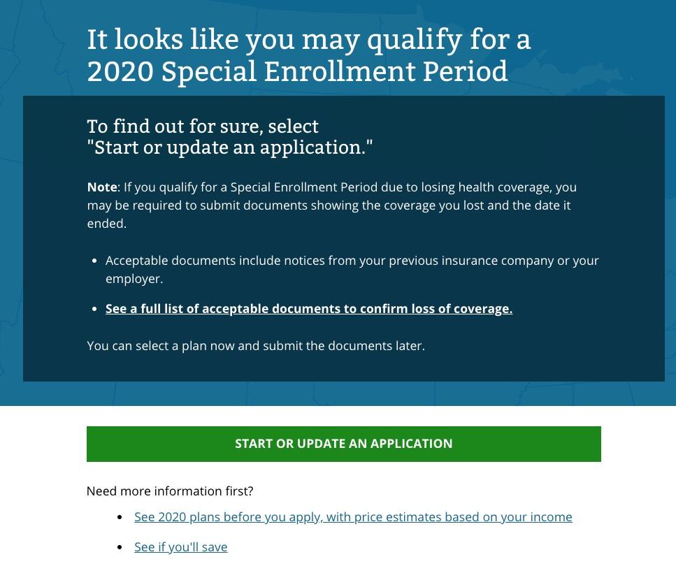 I don't actually see anything in the text above which clarifies anything regarding "flexibility on documentation". I'm not entirely sure what it means...does it mean a simple written explanation like Idaho is allowing? Here's the screens you'll see when you check to see whether you qualify for a Special Enrollment Period. The first three look mostly the same...