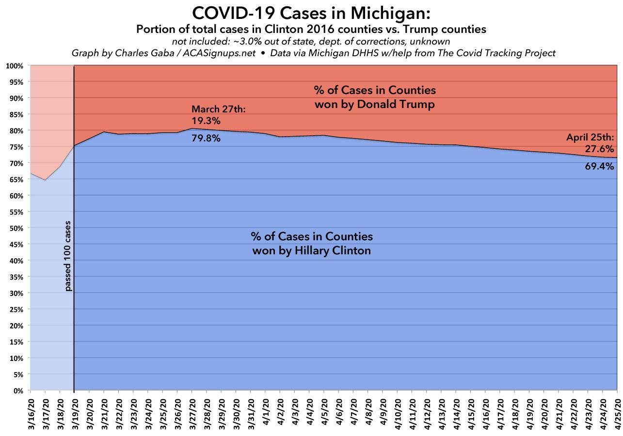 Of course, there are hundreds of thousands of Trump voters who live in those Clinton counties (800,000, to be precise), and nearly a million Clinton voters who live in the other 75 Trump-voting counties, and the virus doesn't care which party you belong to. Therefore, another important way of looking at this is by actual geography...specifically, the "Why should we have to suffer out here in the "heartland"? Coronavirus is a Detroit problem!" mantra being tossed around by certain (ahem) rural Michigan residents, among others.