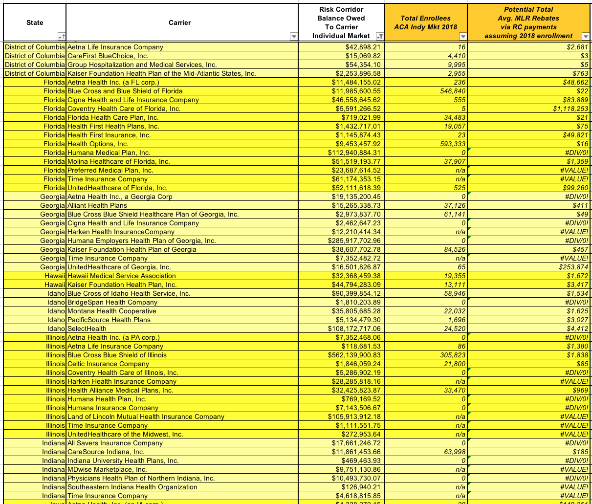 (At the opposite end of the spectrum, as I mentioned earlier, is CareFirst BlueChoice of DC, which is only owed $15,000...and they had 4,400 enrollees in 2018, which means that assuming a similar enrollment this year, each one would likely only receive $3....spread out over 3 years. Enjoy that $1/year, folks!)