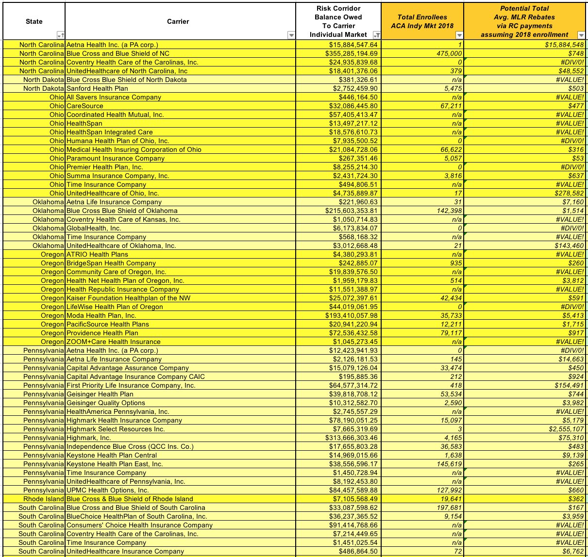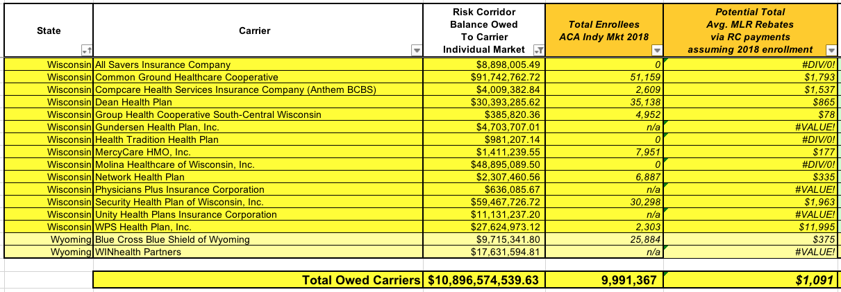 - Fifth: Some of the carriers which are owed RC payments don't exist any longer! Over a dozen non-profit co-ops went belly up in late 2015 (many in large part due to them being stiffed by the feds, I should note!), as did a few other small private carriers, such as WIN Health out of Wyoming. Any money owed to them will instead presumably go to their creditors or whatever hedge fund bought out their debt or whatever. Others may have since been bought out or merged with a larger carrier...which could mean the RC payments go to them instead (and could still potentially have to be paid out as MLR rebates, just by a different insurance company).
