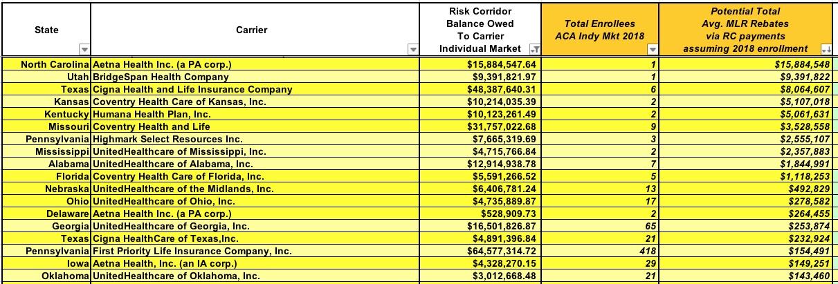 - Third: I took the total amount of Risk Corridor payments owed to each carriers, and divided it by the total number of MLR-eligible individual and small group market enrollees each carrier had as of 2018. Of course, some carriers will have more or fewer enrollees in 2020 than they did in 2018, and some might not even participate in the indy market this year, but it's the best I can do until the 2019 MLR reports are released this August.