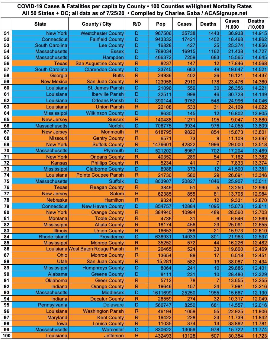 Here's the top 100 counties ranked by per capita COVID-19 fatalities as of Saturday, July 25th (click image for high-res version):
