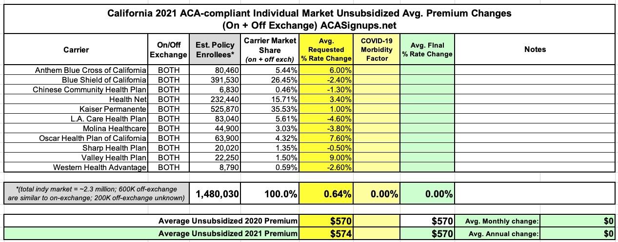 California: @CoveredCA issues preliminary 2021 rate hikes; 0.6% indy market; #COVID19 nominal factor; 230K enrolled via #COVID19 SEP to date