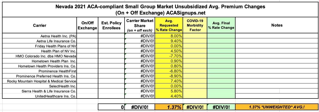 Unfortunately, there's nothing in the press release to give any insight into Nevada's small group market, so I've had to settle for the rate change requests of each of the sm. group carriers. Without any enrollment specifics I have no idea what the weighted average is, but the unweighted average is 1.37%: