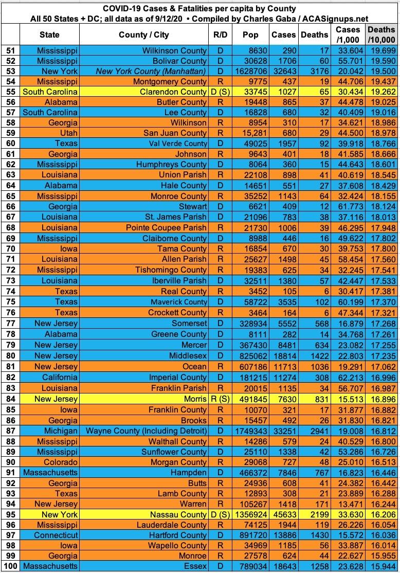 With these updates in mind, here's the top 100 counties ranked by per capita COVID-19 cases as of Saturday, September 12th (click image for high-res version). Blue = Hillary Clinton won by more than 6 points; Orange = Donald Trump won by more than 6 points; Yellow = Swing District