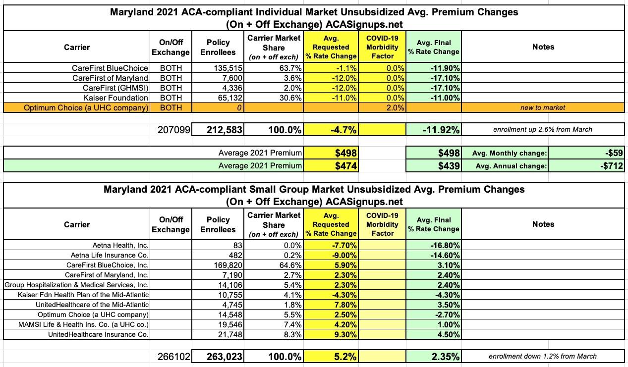 Maryland: Approved avg. 2021 #ACA premiums: 11.9% decrease for indy market, 2.4% increase for sm. group