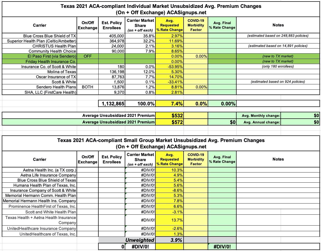 Texas: Preliminary avg. 2021 #ACA premium changes: +7.4% individual, +3.9% sm. group