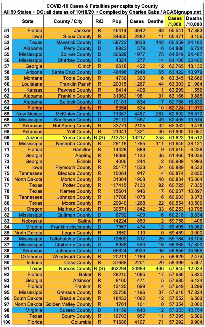 Here's the top 100 counties ranked by per capita COVID-19 fatalities as of Saturday, October 10th (click image for high-res version):