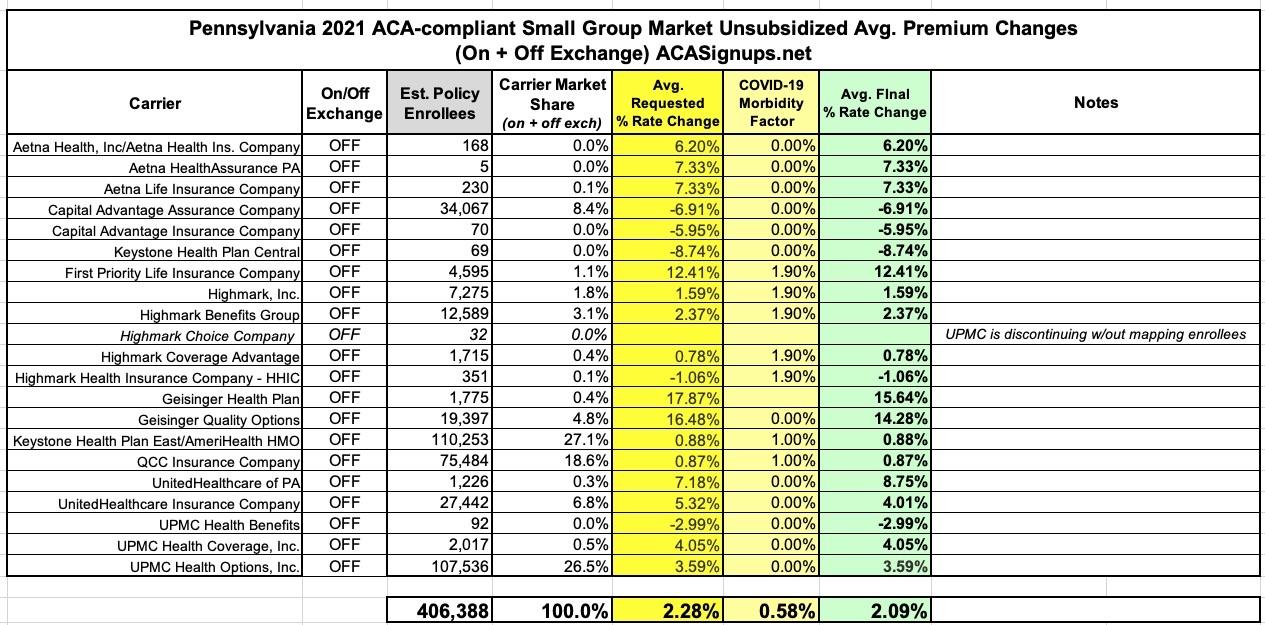 Pennsylvania: *Approved* avg. 2021 #ACA premiums: -3.3% indy market, +2.1% sm. group