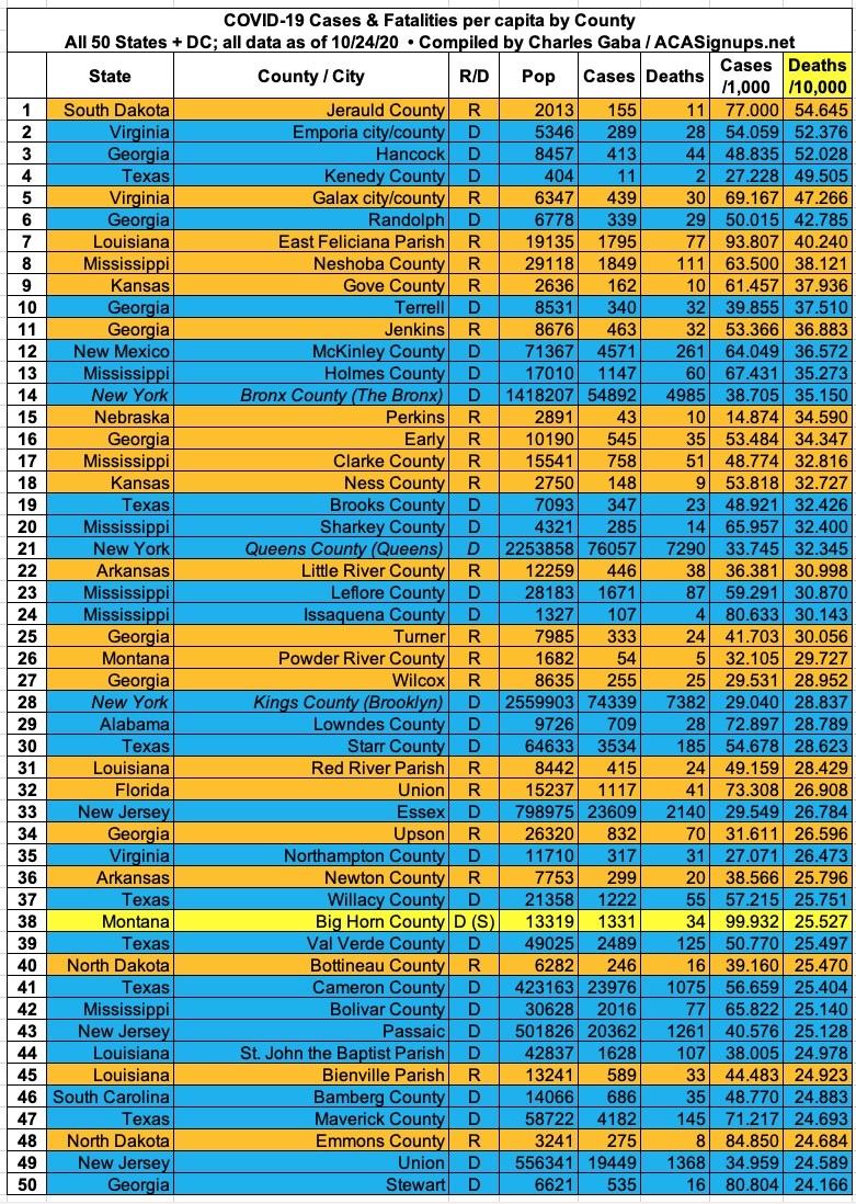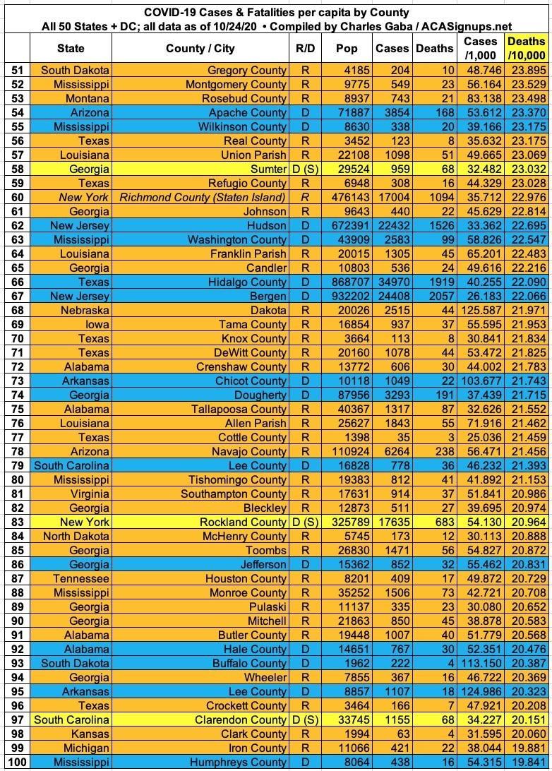 Here's the top 100 counties ranked by per capita COVID-19 fatalities as of Saturday, October 24th (click image for high-res version):
