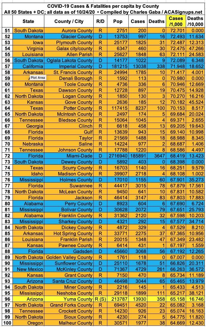 Here's the top 100 counties ranked by per capita COVID-19 fatalities as of Saturday, October 31st (click image for high-res version):