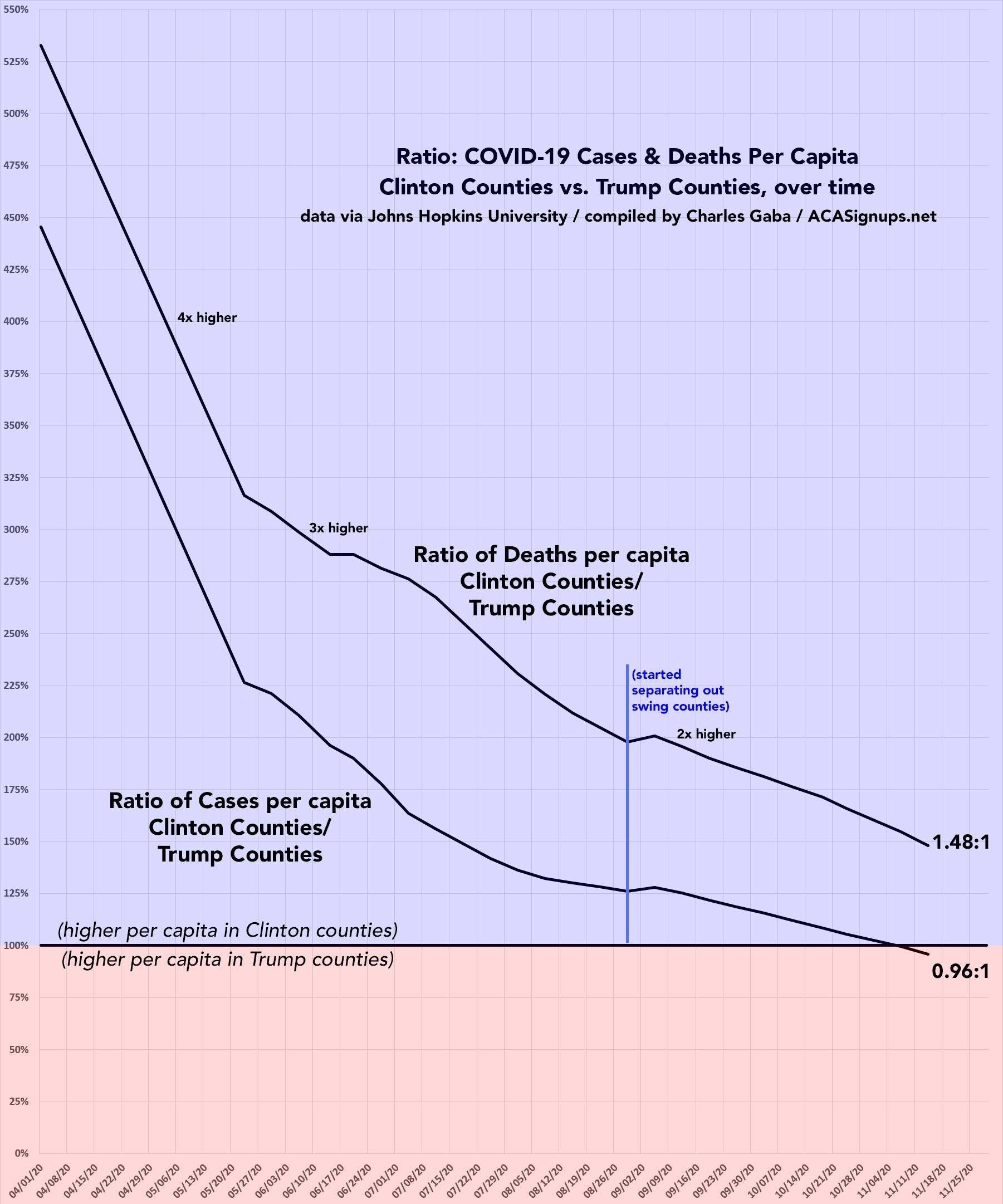 As you can see below, separating out the ~200 swing counties from the Red and Blue ones caused the ratio between the two for both case rates and death rates to bump back up towards a higher blue county rate, but only slightly and only for that one week. The trend has continued downwards since then: