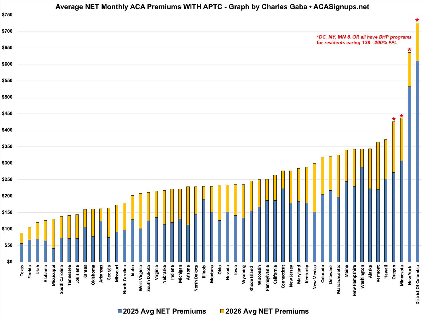 In terms of actual net premiums (again, after federal subsidies are applied), however, Texas has the lowest on average thanks to their robust Premium Alignment pricing strategy, while DC has the highest.