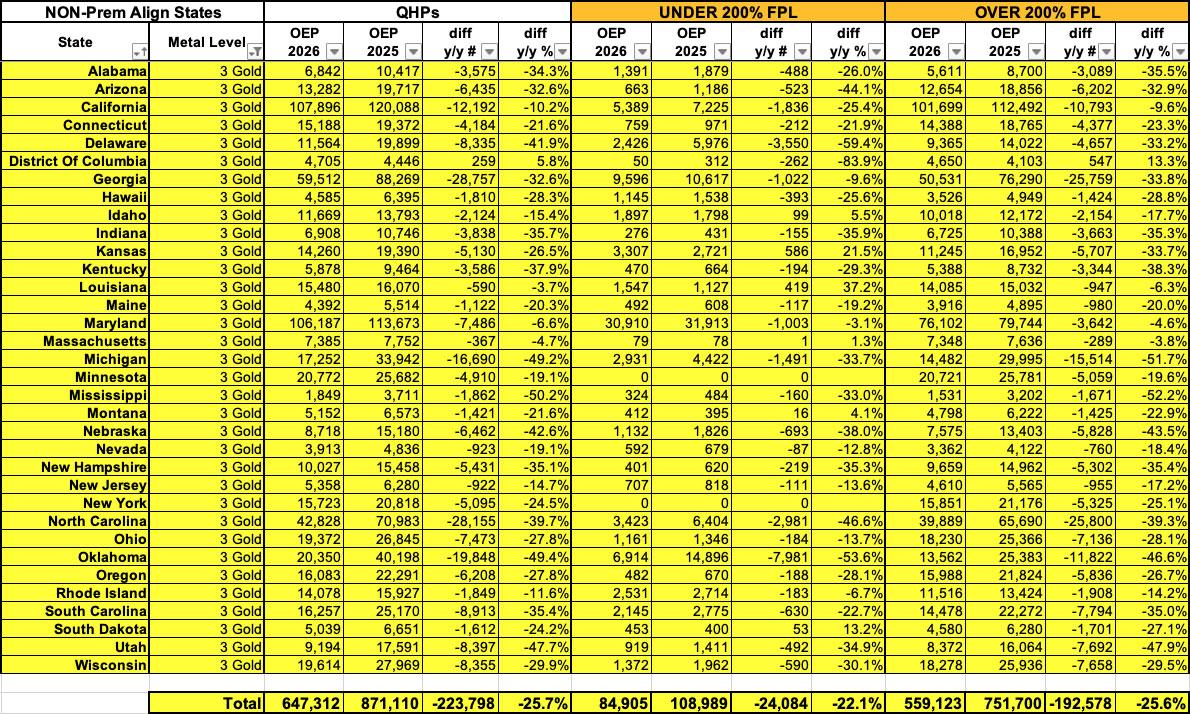 Update 4/11/26: I had Arkansas in the wrong table below; both have been corrected, as have the bullets above, which only makes my point stronger. In addition, notice how in Arkansas, Illinois & Washington State (the three states which newly-implemented Premium Alignment policies this year), Gold enrollment shot up at an even more dramatic rate (anywhere from 10x to 52x higher below 200% FPL). In addition, h/t to Andrew Sprung for pointing out that these are also the only states where it increased over 200% FPL to a significant degree.