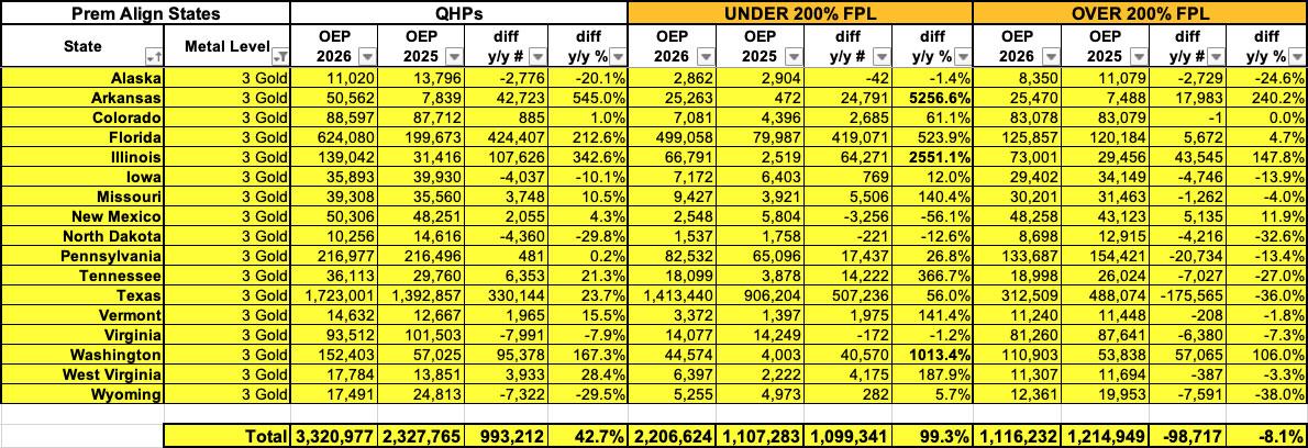 - In the 17 Premium Alignment states, Gold enrollment nearly doubled below 200% FPL, skyrocketing by over 1.1 million people. Over 200% FPL it dropped by ~8% or around 98,000.
