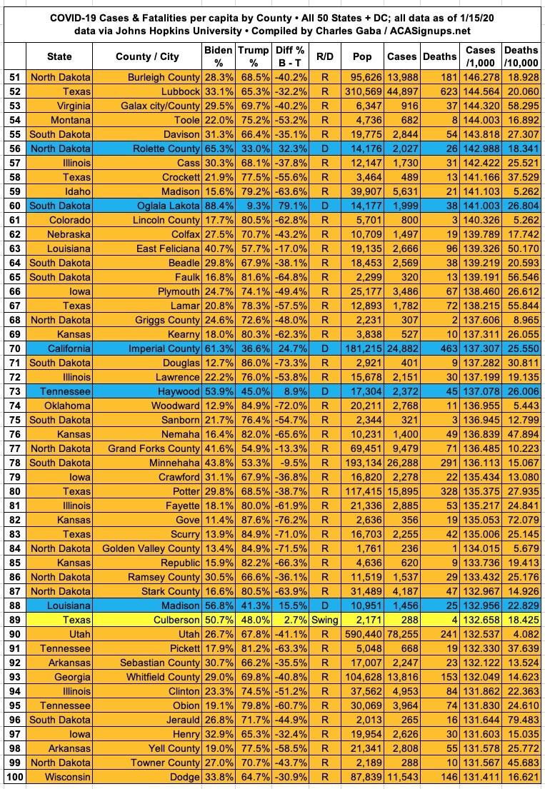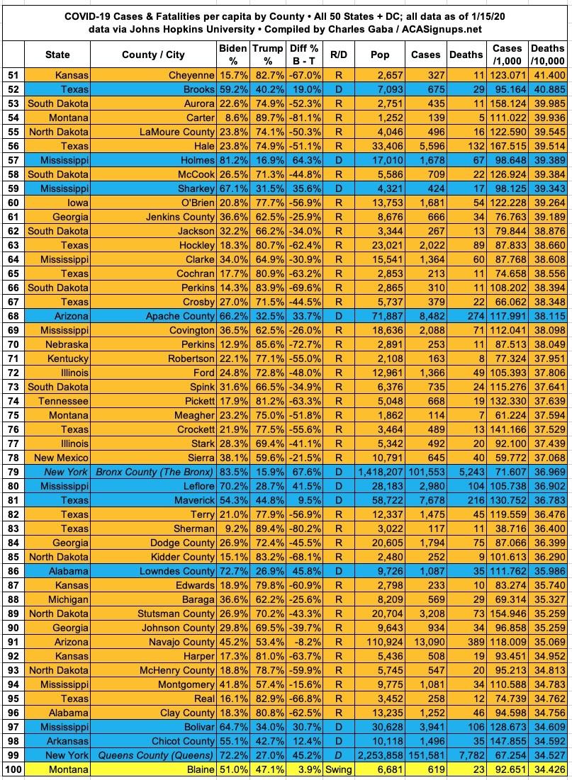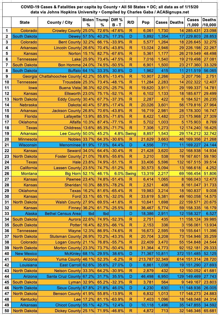 Here's the top 100 counties ranked by per capita COVID-19 fatalities as of Friday, January 15th, 2021 (click image for high-res version):