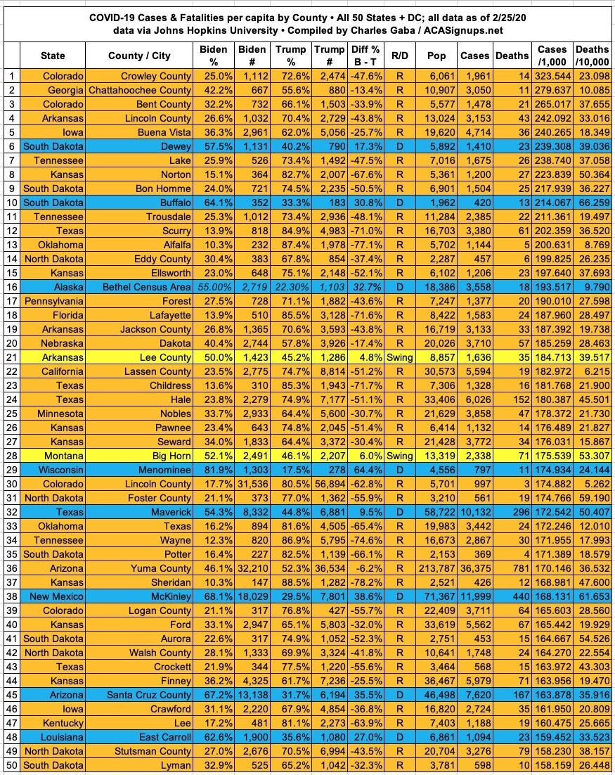 As of today, both cumulative COVID-19 Cases and Deaths per capita are running higher in the Red Counties: