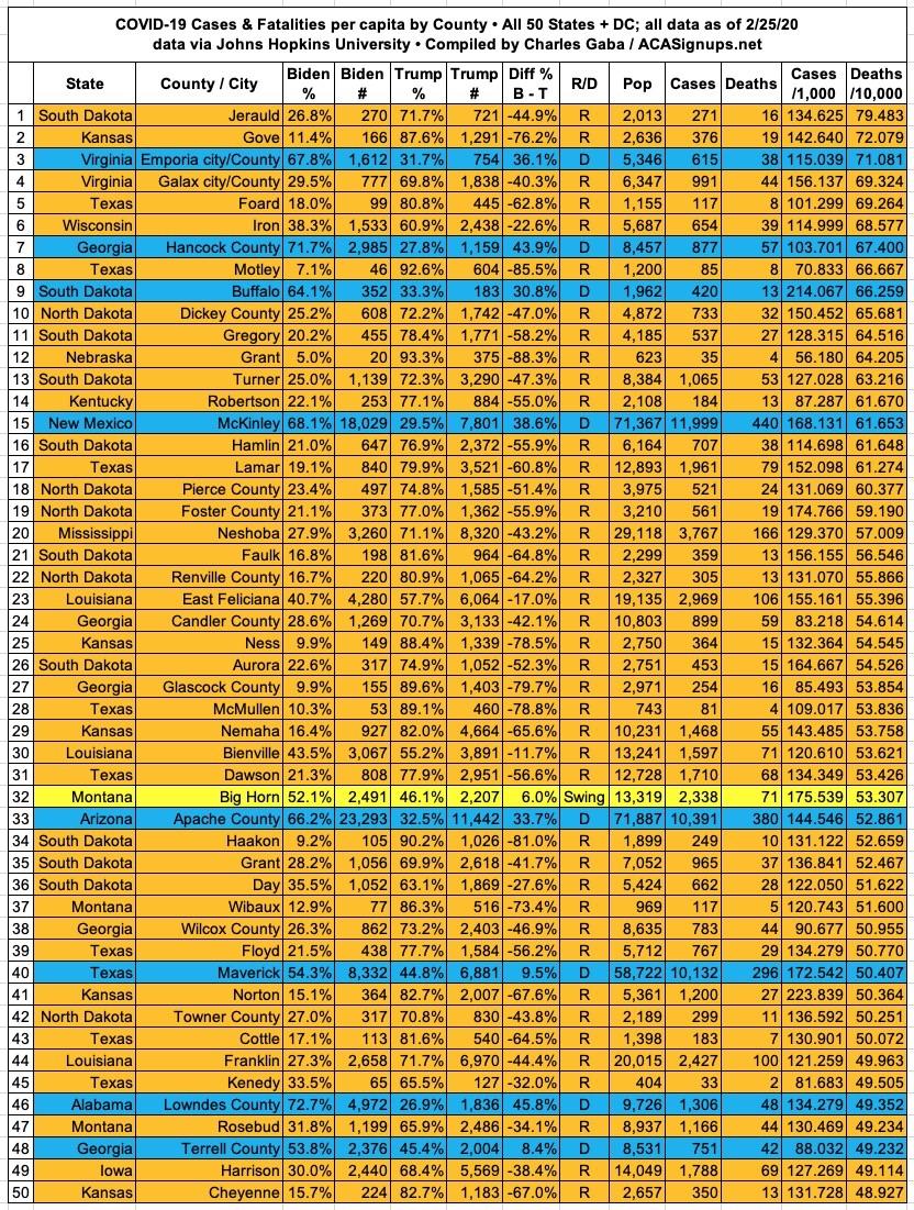 The #1 spot is still Jerauld County, South Dakota, where 16 out of the county's 2,013 residents have died of COVID-19, or 0.8%. That's 1 out of every 125 residents.