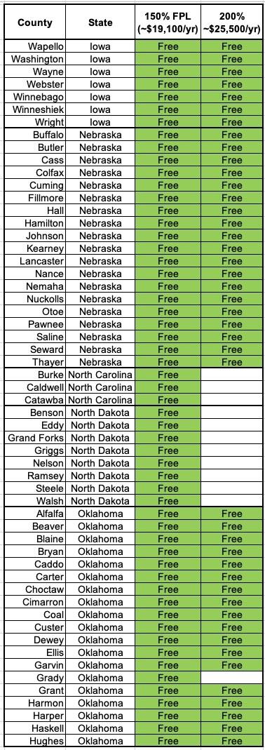 Of the 221 total counties listed above, Anderson says that around 190 of them would still have $0 Gold for single adults earning $21,000/year; 74 counties would still be $0 Gold at $24,000/year; 32 counties at $27,000/year and 10 counties--all of them in Oklahoma--still have FREE GOLD PLANS, with just a $500 deductible, available for single adults earning up to $34,750/year (272% FPL):