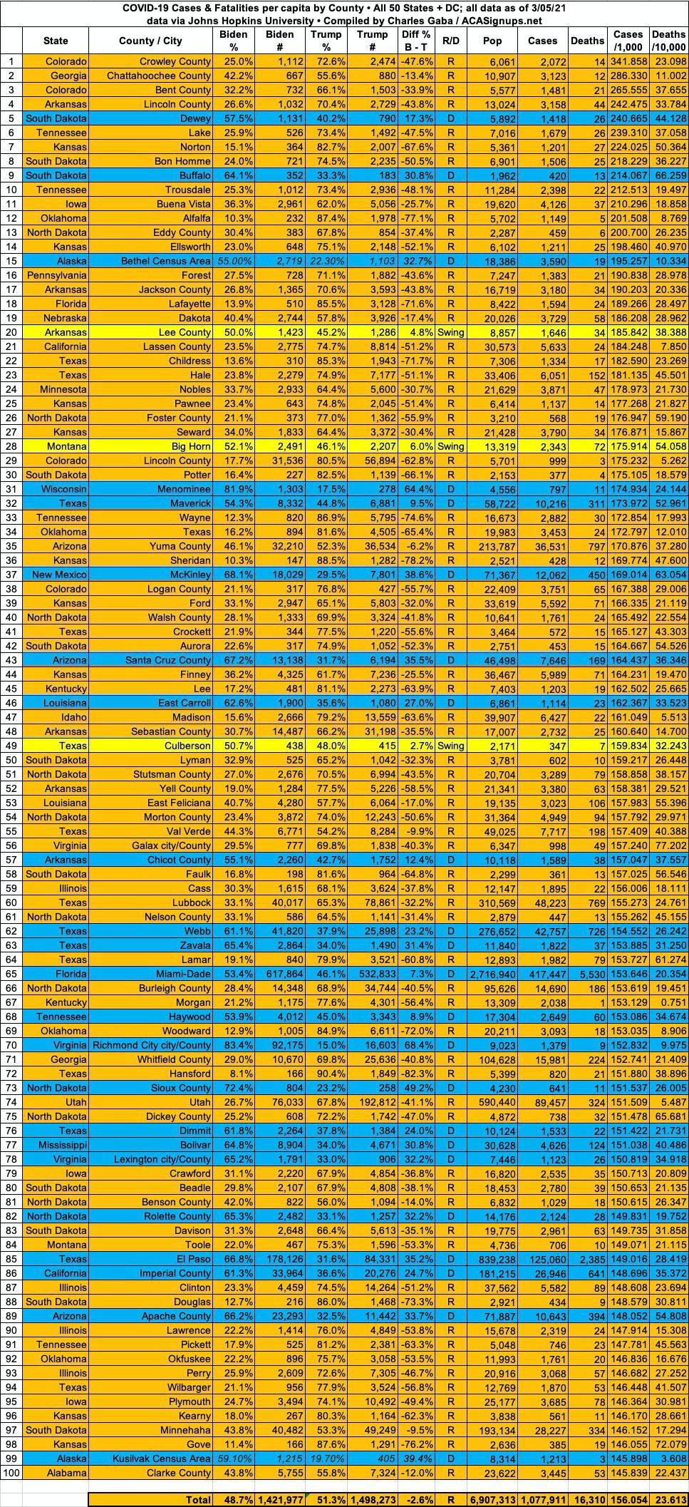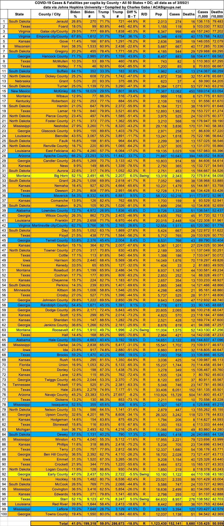 Here's the top 100 counties ranked by per capita COVID-19 fatalities as of Friday, March 5th, 2021 (click image for high-res version):
