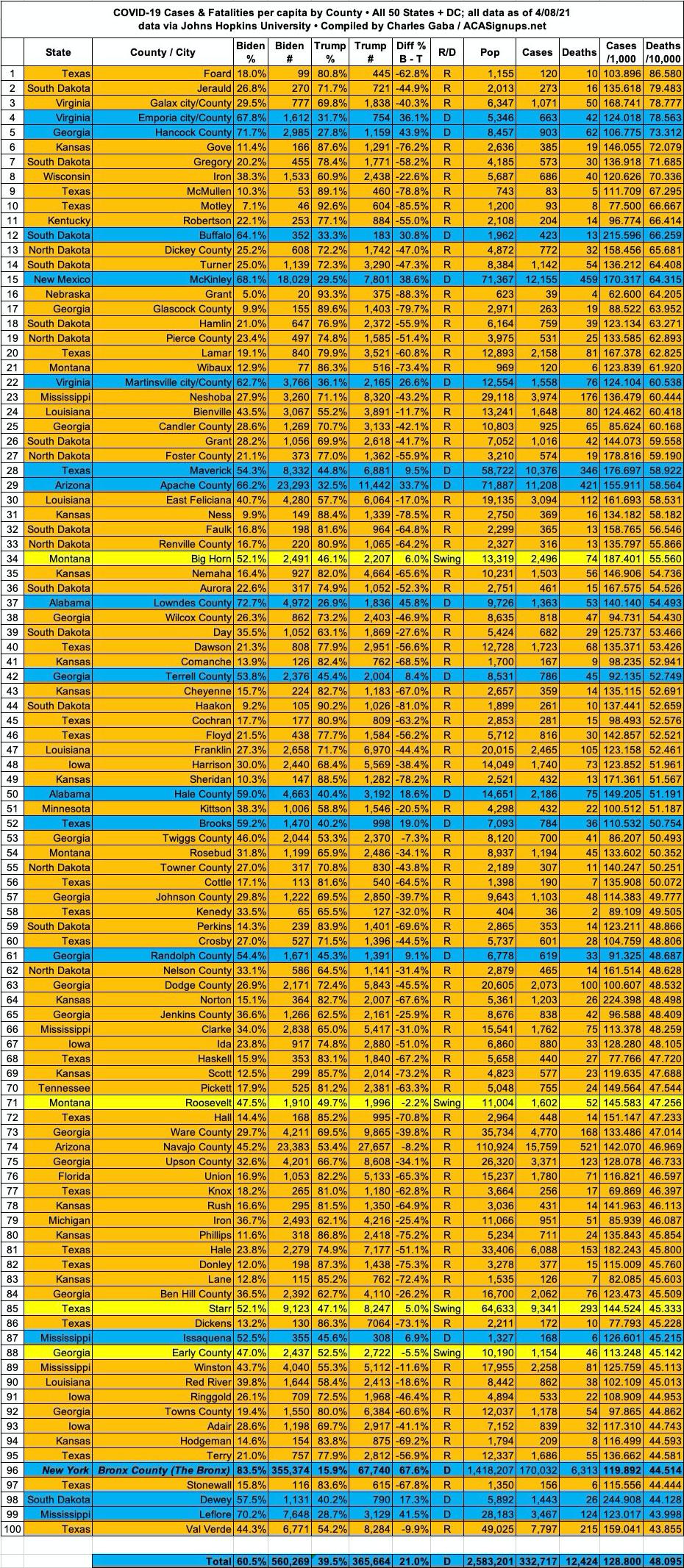 Here's the top 100 counties ranked by per capita COVID-19 fatalities as of Thursday, April 8th, 2021 (click image for high-res version):