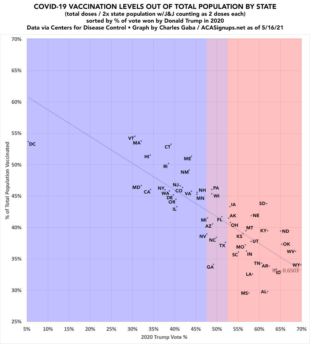 Otherwise, assuming there aren't any significant errors, here's what it looks like: COVID-19 Vaccination levels for the entire population in 3,140 counties nationwide, sorted out by Trump's % of the 2020 Presidential election vote. Behold!