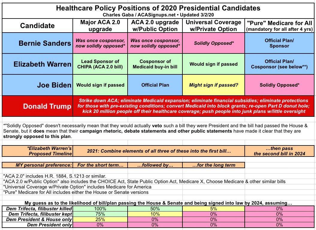 Well, it's more complicated than that. Most of the Senators (and some of the House members) running have actually cosponsored other significant healthcare expansion bills as well as "pure" Medicare for All...and many have made public statements indicating that they'd likely also be open to some of the other bills on the table (or some variant thereof). Harris has formally split from her prior support of Bernie's bill and is now proposing a hybrid variant which would allow for a "Private Option" in the form of beefed-up Medicare Advantage plans with much tighter regulations (similar to my preferred bill, "Medicare for America")...but she still calls her plan "Medicare for All", confusing the issue further.