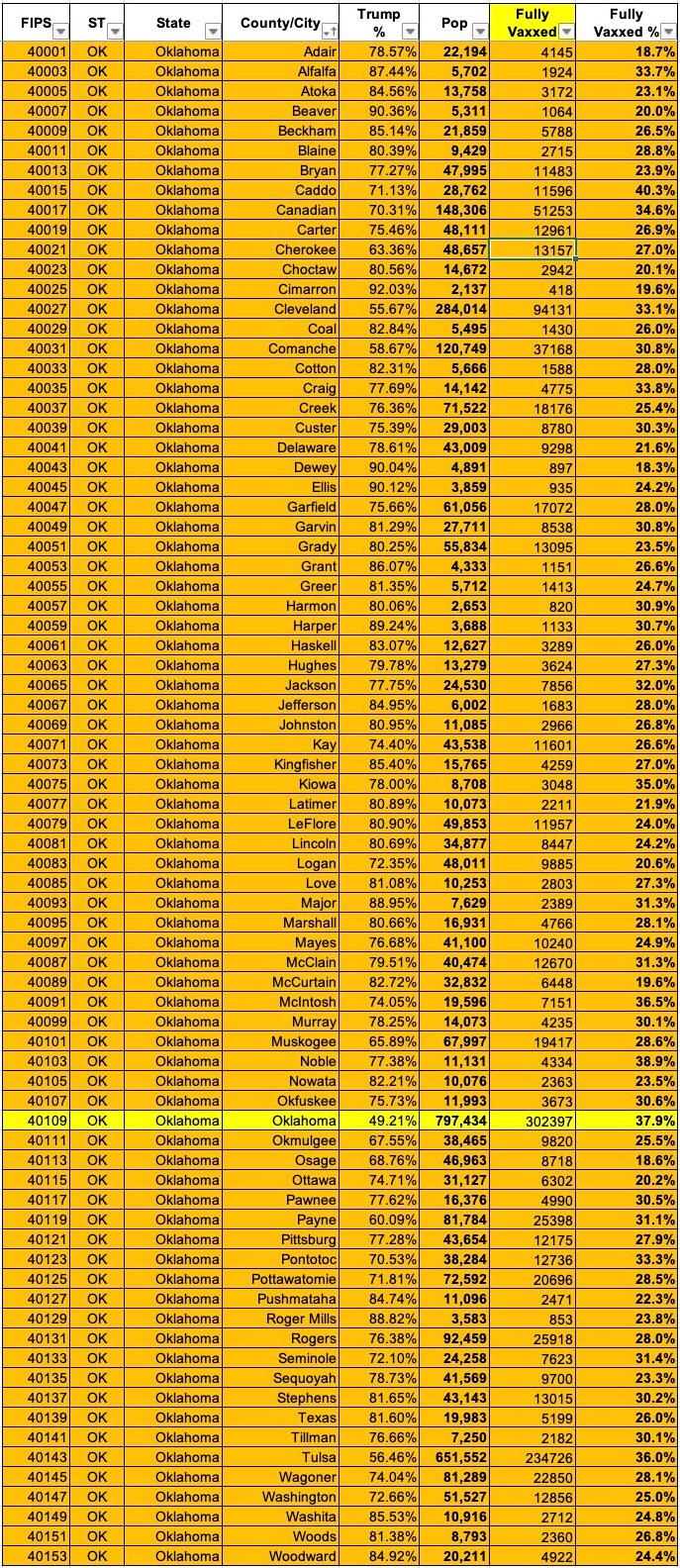 NOTE: The CDC lists ~91,000 Oklahoma residents (7.3% of the total fully vaccinated) whose county of residence is unknown.